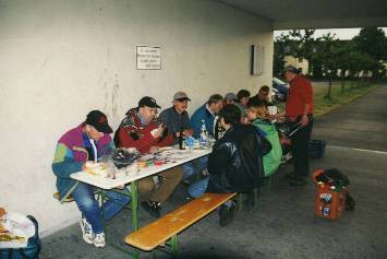 sitzend: Janet Fowler-Michel mit Tochter Johanna, Andreas Rösch, Jürgen Kreß, Andi Schulze, Urte Pautz, Rainer Bretag mit Sohn Jonas.